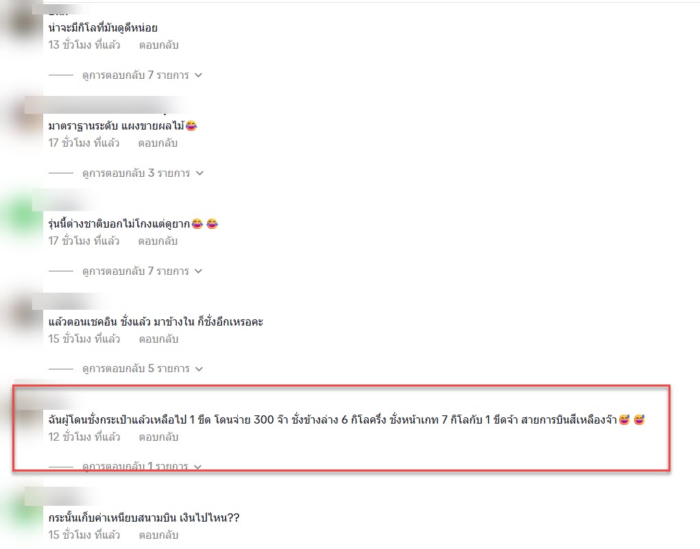 จากคลิปนี้ก็มีหลายคนเข้ามาแสดงความคิดเห็นกันอย่างมากมายทั้งบอกว่า”ฉันผู้โดนชั่งกระเป๋าแล้วเหลือไป 1 ขีด โดนจ่าย 300 จ๊า ชั่งข้างล่าง 6 กิโลครึ่ง ชั่งหน้าเกท 7 กิโลกับ 1 ขีดจ้า สายการบินสีเหลืองจ๊า”