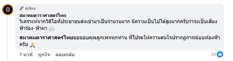 ล่าสุด ทาง สมาคมดาราศาสตร์ไทย ได้อัปเดตว่า เวลา 8.55 น. วิเคราะห์จากวิดีโอที่ลูกเพจหลายท่านส่งเข้ามา มีความเป็นไปได้สูงมาก ที่จะเป็นเสียงฟ้าร้อง-ฟ้าผ่า ขอขอบคุณลูกเพจทุกท่าน ที่โปรดให้ความสนใจปรากฏการณ์บนท้องฟ้าครับ