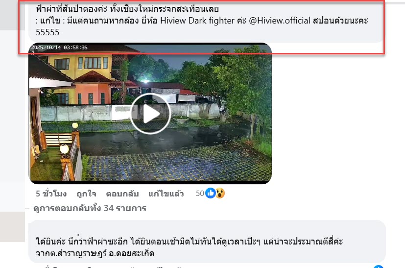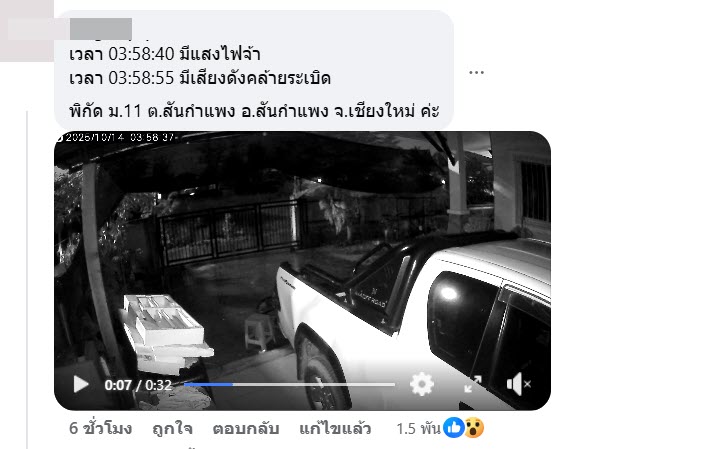 “เวลา 03:58:40 มีแสงไฟจ้า เวลา 03:58:55 มีเสียงดังคล้ายระเบิด พิกัด ม.11 ต.สันกำแพง อ.สันกำแพง จ.เชียงใหม่ ค่ะ”