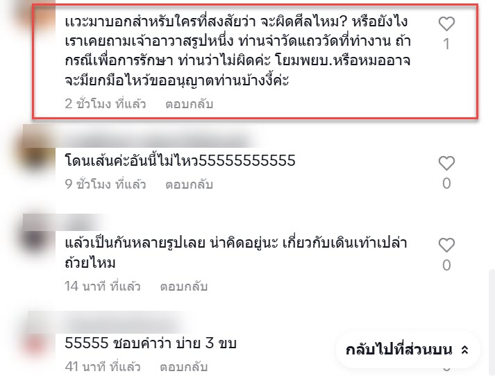 “เเวะมาบอกสำหรับใครที่สงสัยว่า จะผิดศีลไหม? หรือยังไง เราเคยถามเจ้าอาวาสรูปหนึ่ง ท่านจำวัดแถววัดที่ทำงาน ถ้ากรณีเพื่อการรักษา ท่านว่าไม่ผิดค่ะ โยมพยบ.หรือหมออาจจะมียกมือไหว้ขออนุญาตท่านบ้างงี้ค่ะ”