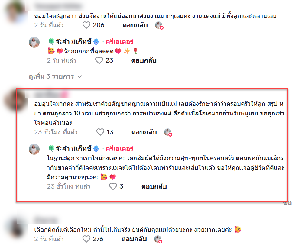 “อบอุ่นใจมากค่ะ สำหรับเราด้วยสัญชาตญาณความเป็นแม่ เลยต้องรักษาคำว่าครอบครัวให้ลูก สรุป หย่า ตอนลูกสาว 10 ขวบ แล้วลูกบอกว่า การหย่าของแม่ คือดับเบิ้ลโอเคมากสำหรับหนูเลย ขอลูกเข้าใจพอแล้วเนอะ”