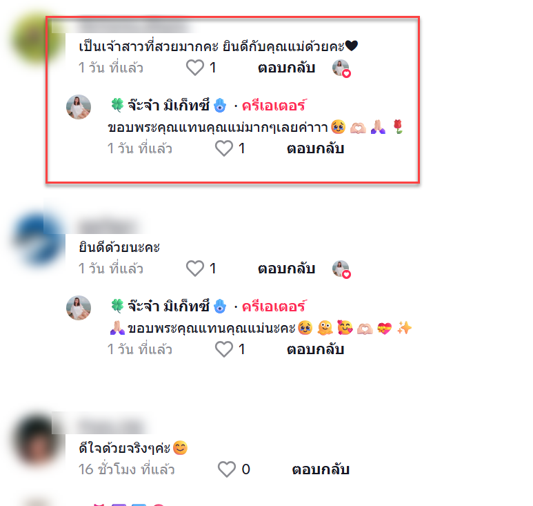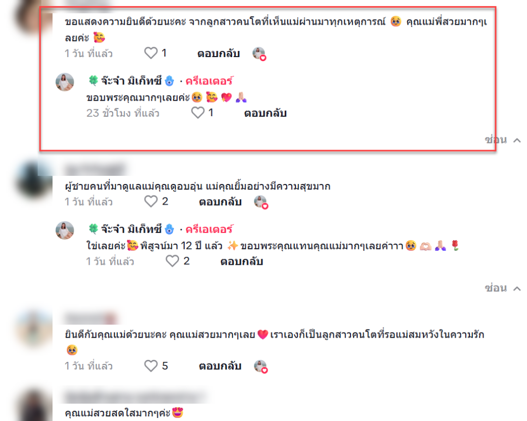 “ขอแสดงความยินดีด้วยนะคะ จากลูกสาวคนโตที่เห็นแม่ผ่านมาทุกเหตุการณ์ คุณแม่พี่สวยมากๆเลยค่ะ”