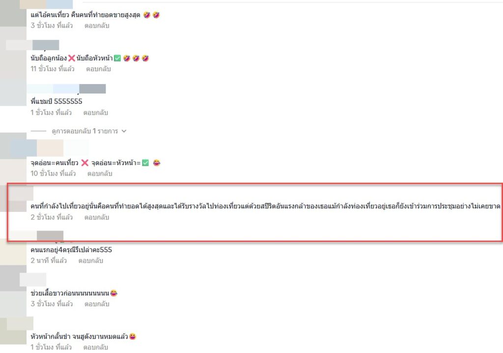 “คนที่กำลังไปเที่ยวอยู่นั่นคือคนที่ทำยอดได้สูงสุดและได้รับรางวัลไปท่องเที่ยวแต่ด้วยสปิริตอันแรงกล้าของเธอแม้กำลังท่องเที่ยวอยู่เธอก็ยังเข้าร่วมการประชุมอย่างไม่เคยขาด“